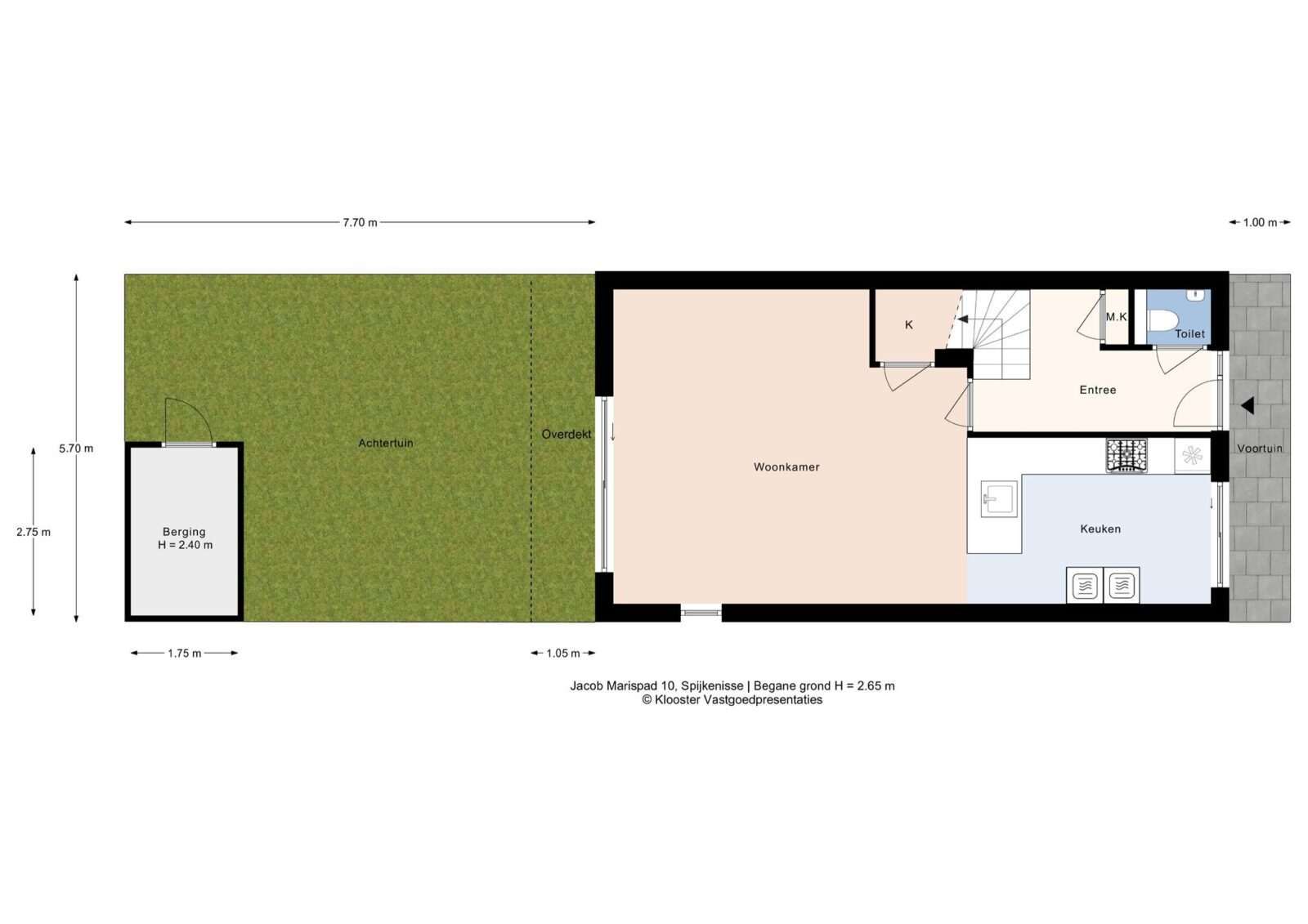 The maintenance-free backyard (7.70×5.70) located on the South has artificial grass and a detached maintenance-free storage room (2.75×1.75) with a concrete floor and electricity.
